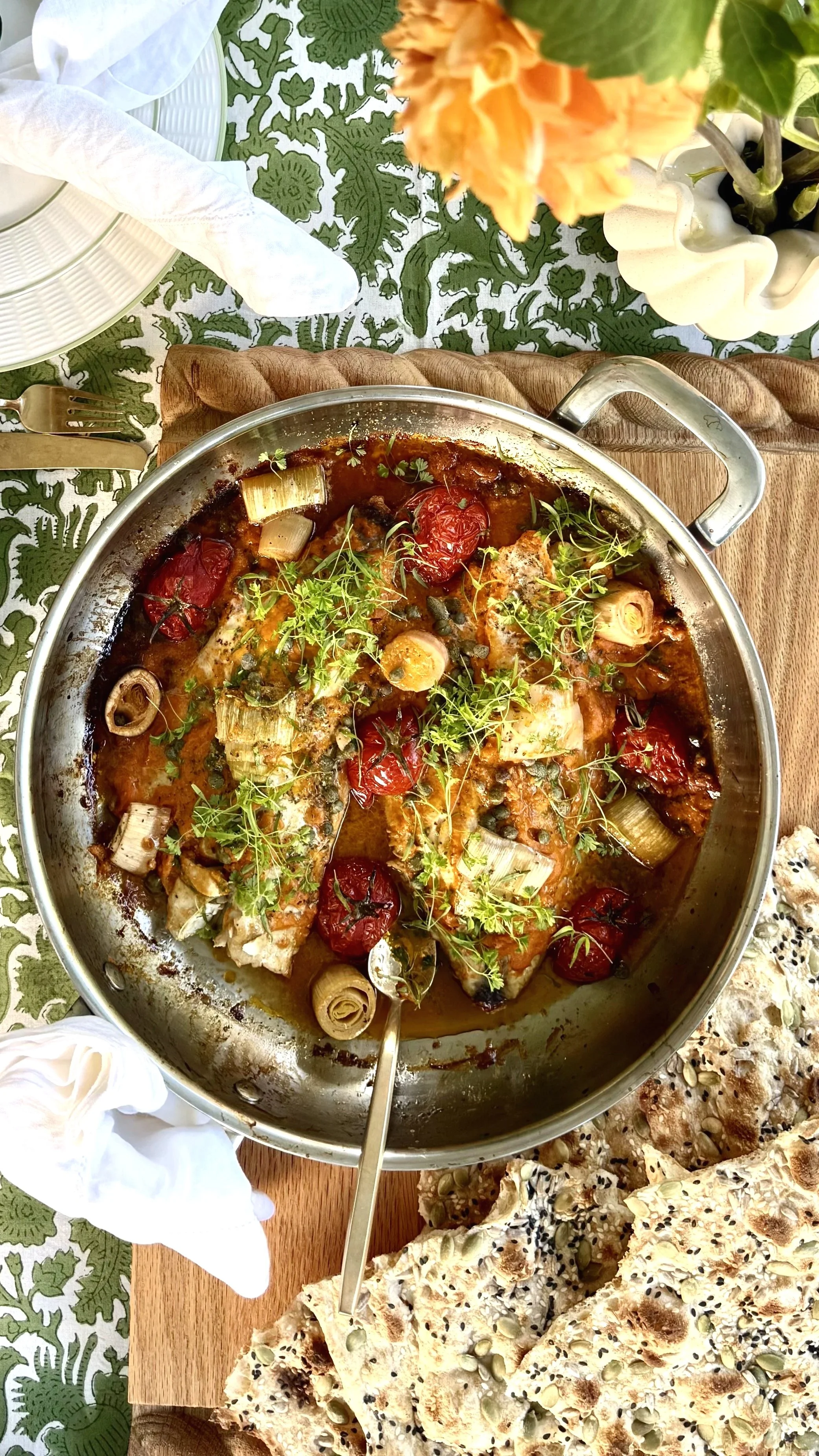 5. Place fillets skin-side down, then spoon over the creamed tomato and leek mixture. Top with the reserved leek and tomatoes and scatter over the capers.