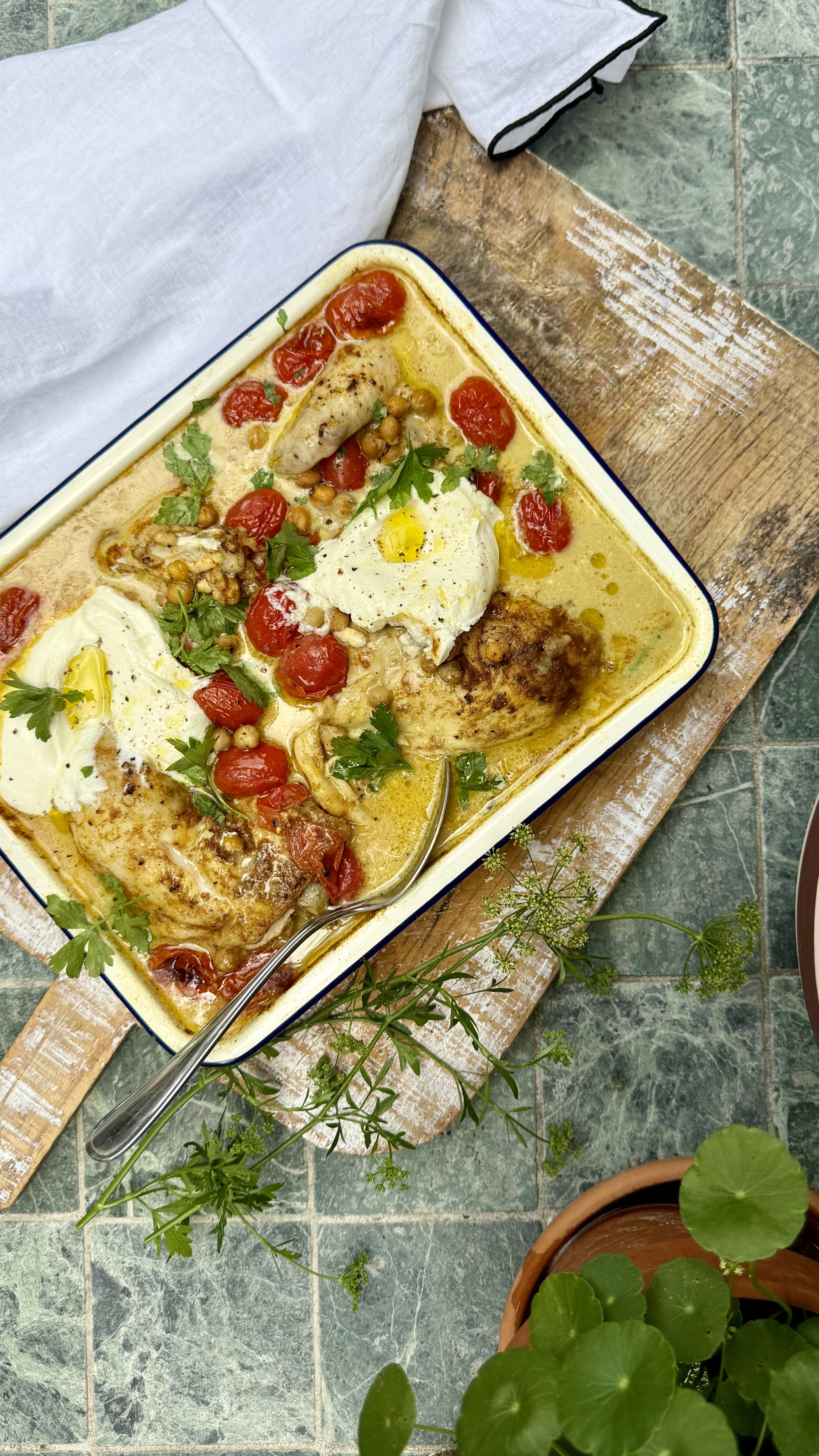 3. Scatter the chickpeas and sugarplum tomatoes around the chicken.