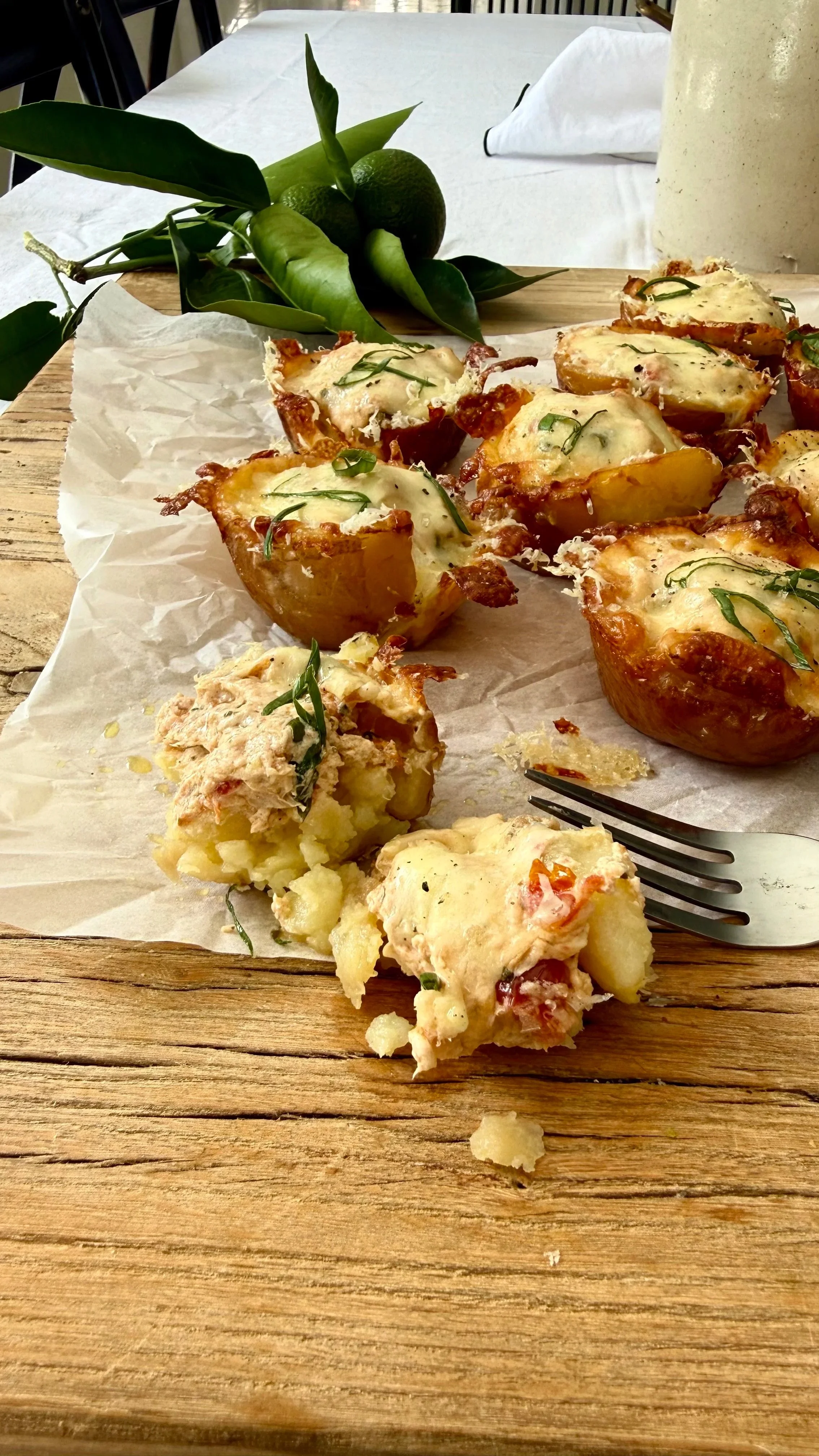 5. Remove the potatoes from the oven. Spoon the tuna mixture evenly into each potato cup with a teaspoon. Scatter over the mozzarella, then finish with parmesan.