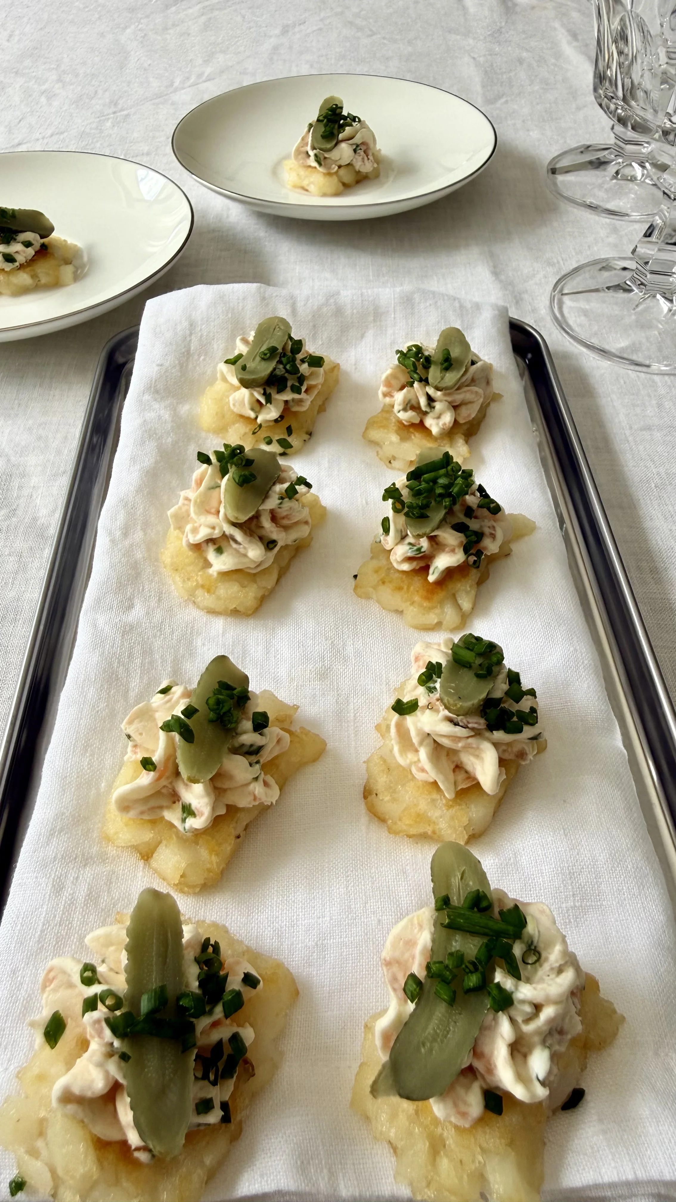 3. Arrange the luke warm (not hot as the cream cheese will melt off) potato gems on a serving platter lined with a linen napkin. Pipe the smoked salmon and cream cheese mixture, onto each potato gem. Giving it a little twist at the end to detach. Repeat with each potato gem and.